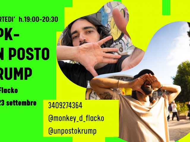 “upk-Un Posto Krump” con Flacko ogni martedi dalle 19:00 alle 20:30 INFO 3409274364 @monkey_d_flacko | @unpostokrump dal 23 settembre Una forma d’arte urbana, nata nei ghetti di Los Angeles, Il Krump è una danza potente, che permette di esprimere e trasformare le emozioni in movimento. ci alleneremo insieme a partire dal 23 […]