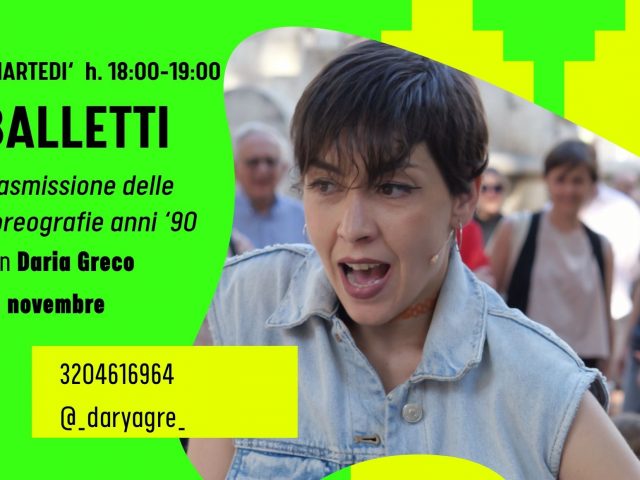 BALLETTI con Daria Greco Tutti i mercoledì di Febbraio e Marzo h 18:00 – 19:30 BALLETTI è un progetto di trasmissione fedele delle coreografie dei videoclip musicali. Negli anni Novanta, popstar come Britney Spears, Backstreet Boys, Spice Girls, Ricky Martin, Janet Jackson, solo per citarne alcuni, hanno combinato la propria musica con la danza costruendo […]